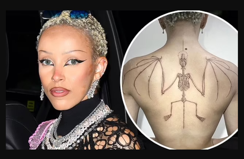 Another striking tattoo is the bat skeleton on her arm. Bats have long symbolized intuition, nocturnal creativity, and transformation. A skeleton adds an additional layer of starkness, suggesting themes of rebirth, decay, and the inner structures we hide from the world. In the context of Doja Cat’s artistic journey, this tattoo symbolizes shedding old versions of herself and emerging with a more honest, unfiltered identity.